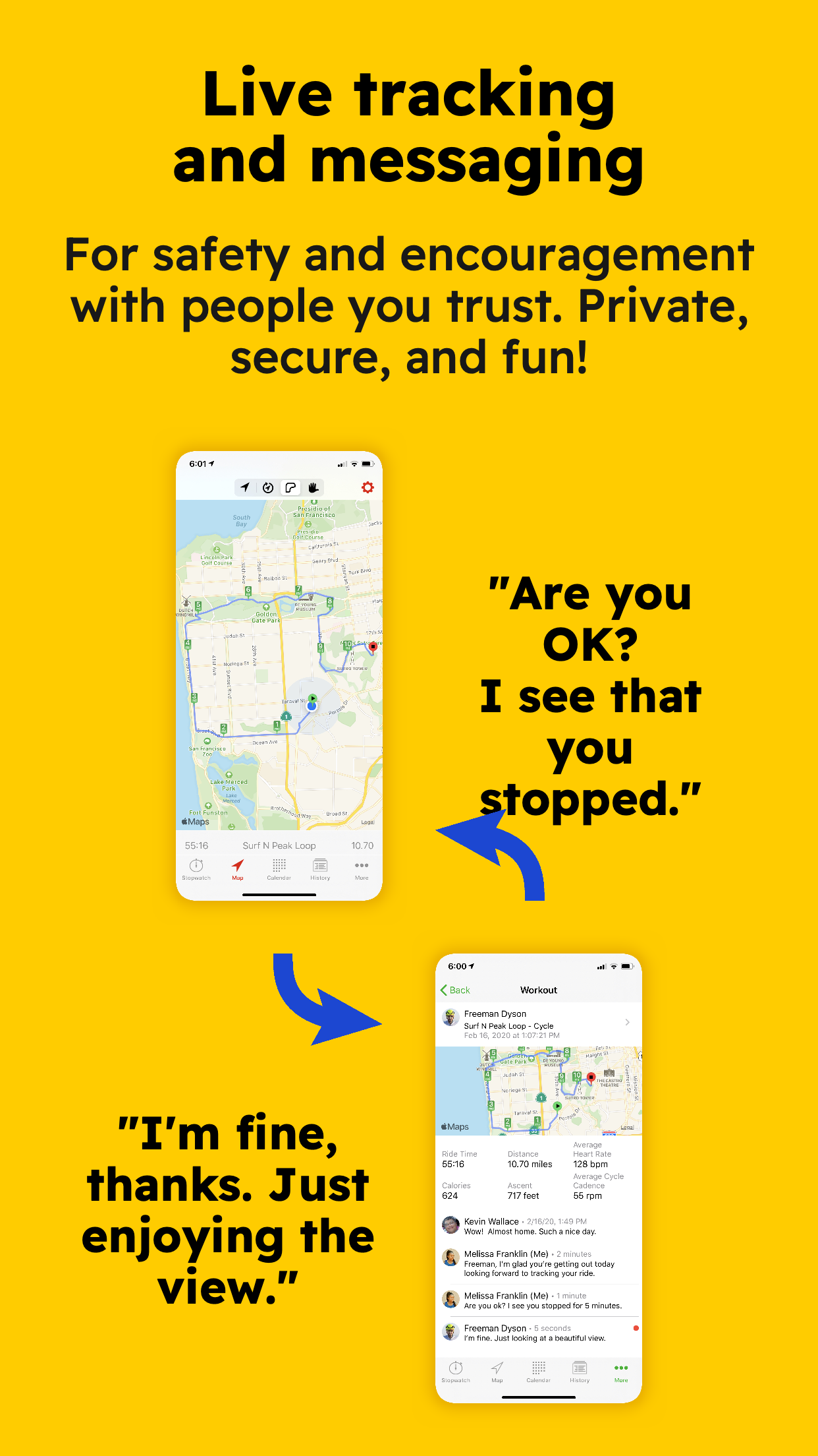 For safety and encouragement, invite people you trust to securely track your workouts for free. They will see your location and path on a map, and dozens of stats. They can also type in comments on your workout which will be spoken to you using text-to-speech. It's private, secure, and free!
