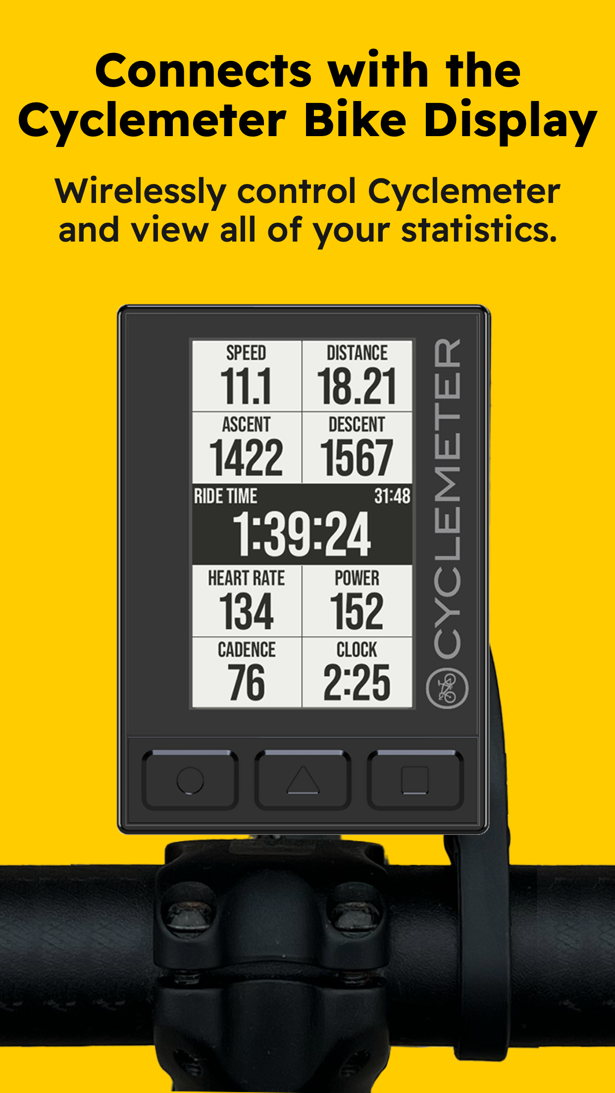 Keep your phone safely in your pocket. The Cyclemeter Bike Display wirelessly connects to Cyclemeter and gives you control over starting, stopping, marking the beginning of a new interval or segment, as well as viewing hundreds of statistics that are collected by Cyclemeter.